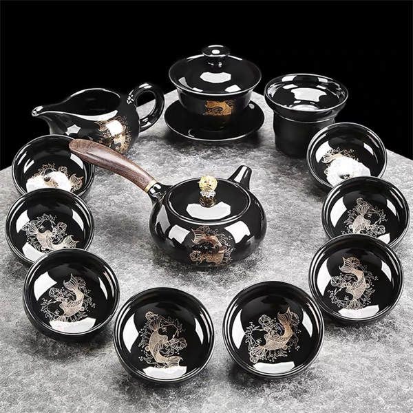 Black Glaze Koi Side-handle Teapot 12-piece Set